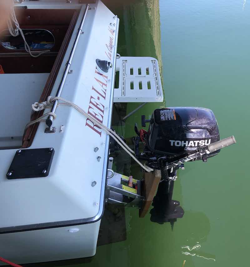 I ~adjusted the outboard mount. The main engine is 4-cylinder, but only sensible to have a backup, eh? So the good man who sold me the boat threw in a new outboard too. Trouble is, the mount on the back was for a different-shaft-length OB.