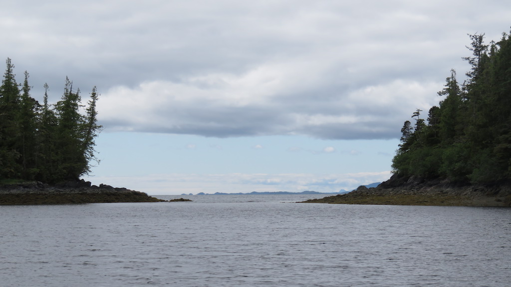 Initially everything was great. Grey, dull, sea not 'glassy' but the waves insignificant and from behind (north). I see a whale spout, yay! Then i head off across Big Water, where of course as time passes it gets worse. And worse. Now the waves are from the ocean (SW), 4 or 5'. I want to make it around Cape Fox, but finally i think, tho not dangerous, i can handle it now, but what's going to happen?