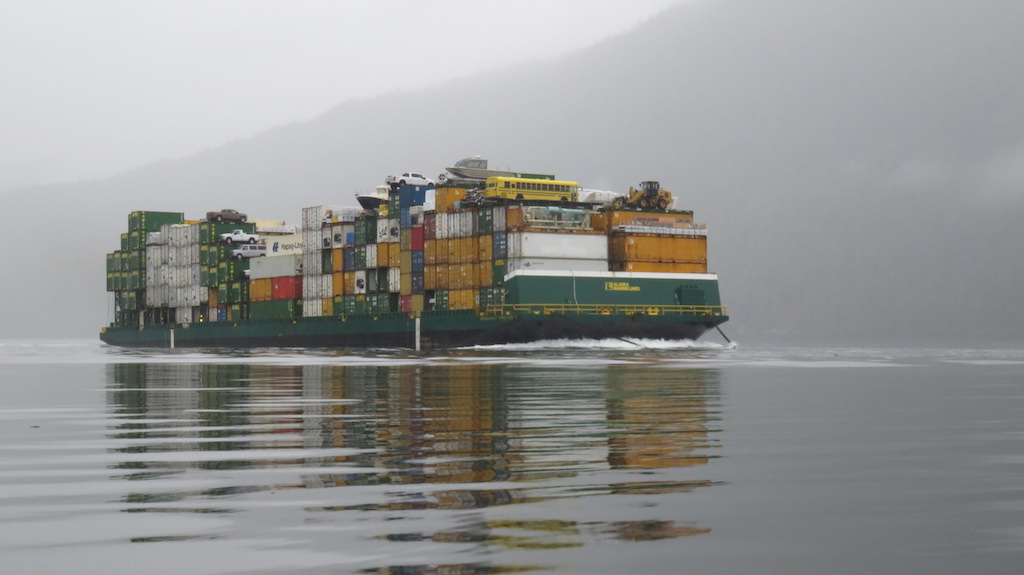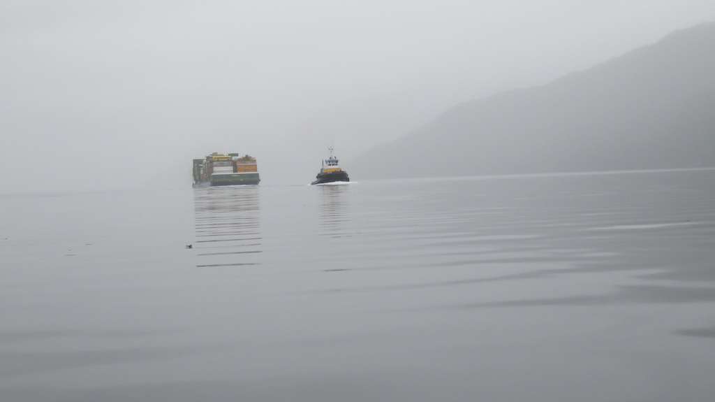Ahead, mid-channel, 2 dark forms. The chart showed no islands. From the squarish bulk, I deduced it was a tug & barge, but which way they were headed was unclear. The visibility was so poor, i had my nav lites on, but he did not. (He did not have a visibility problem; he had radar.)