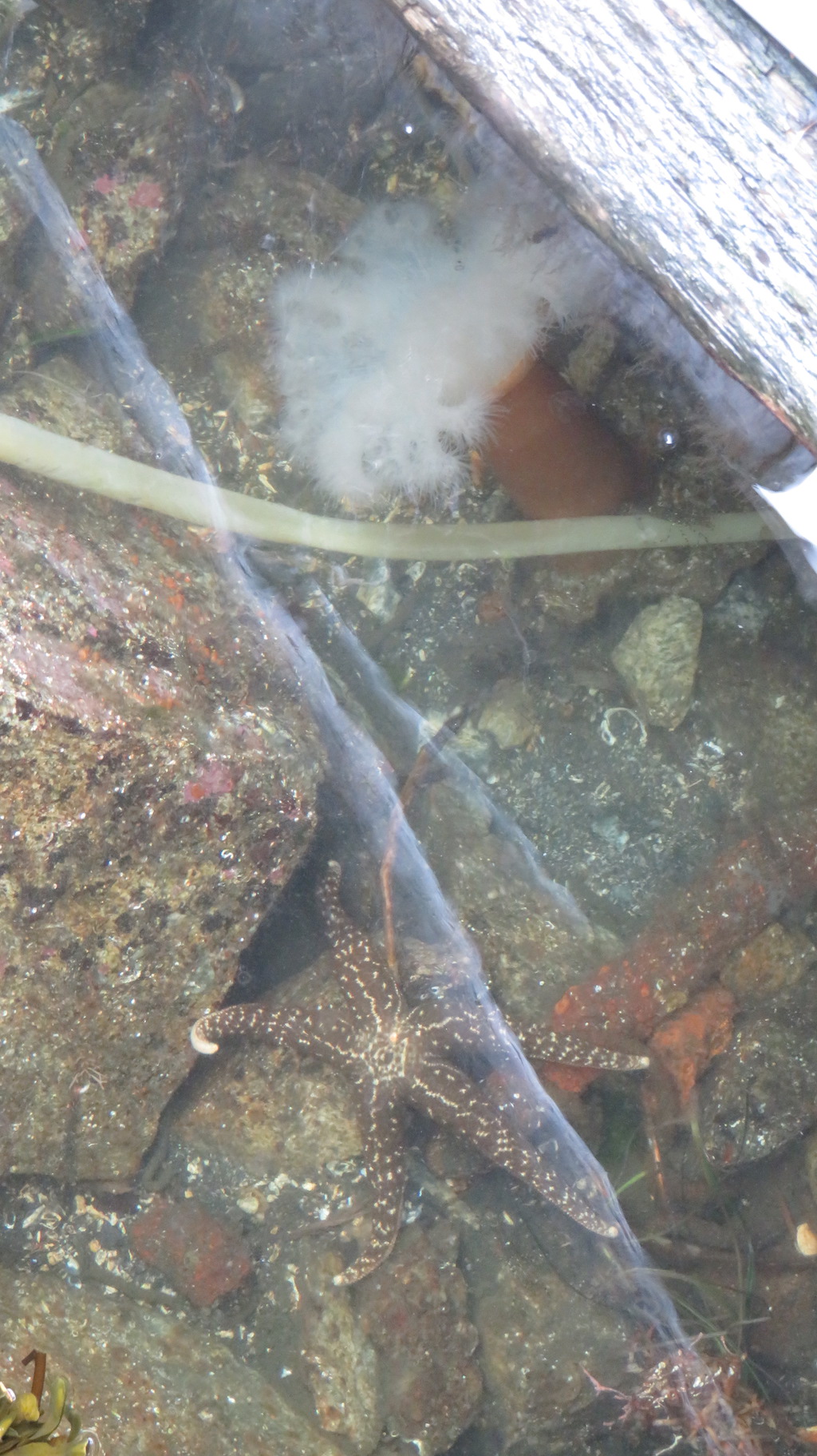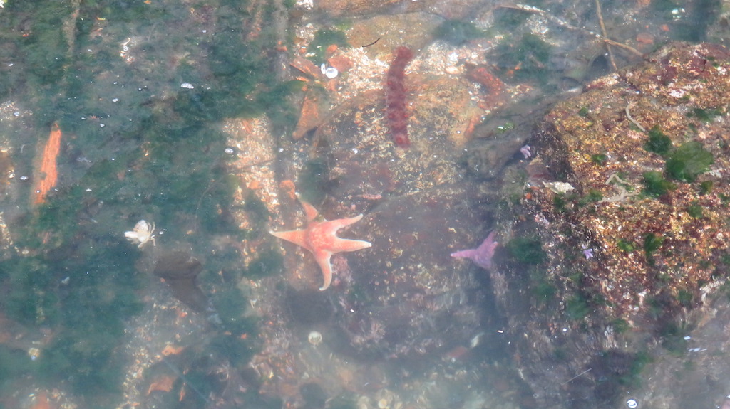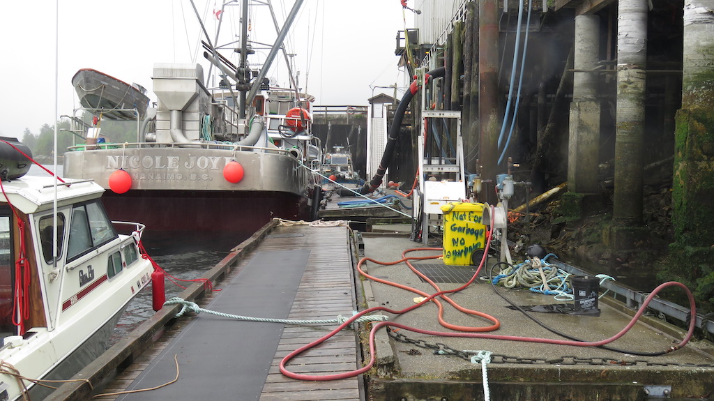 Got gas at Klemtu. I described the visibility problem i was having to the older 1st Nation attendant, but added: "but you must do it blindfolded". He agreed he knew it all well, he'd been a diver for researchers for many years. Low tide, we both complained about the ramp, this one i wrapped the rail tight with both arms going down, it was so steep, wet. There was abundant tide pool life adjacent to the dock.