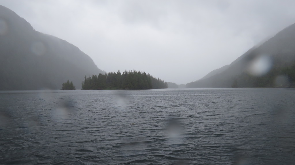 Ahead was 1 of the scary sections i'd experienced on the way north, and i definitely didnt want to do it in this weather. So tho it was only ~10am, i picked out a cove close to Klemtu and parked it. It's not the greatest spot, it's a bit overexposed to the south wind, which is forecast to increase thru the afternoon. But there's cell coverage. Indeed it's raining & winding harder, even briefly fierce at times, but my stern anchor system (to any mariner, clearly i dont know what i'm doing) is holding as i bob along in the cabin, dry and almost warm.