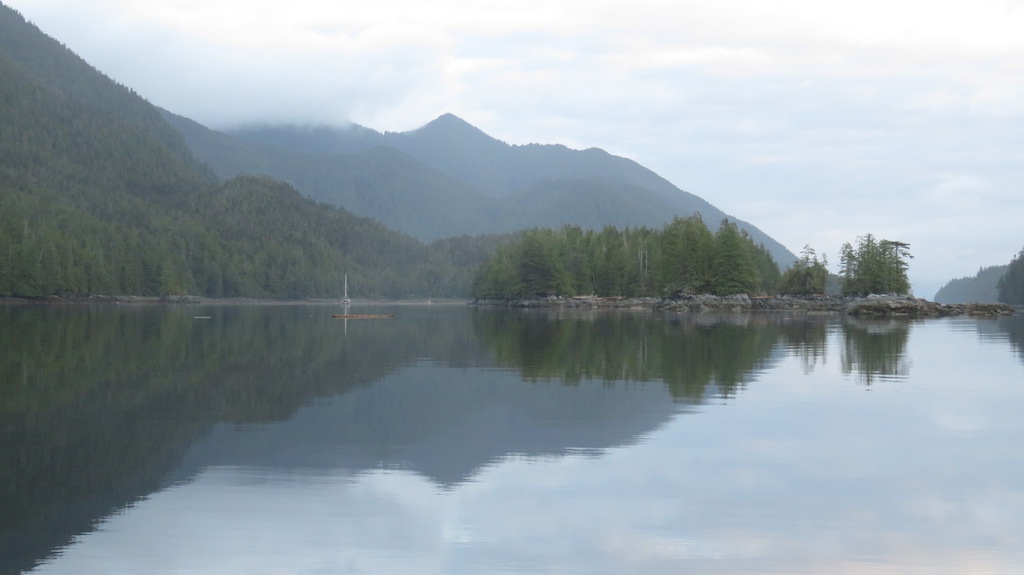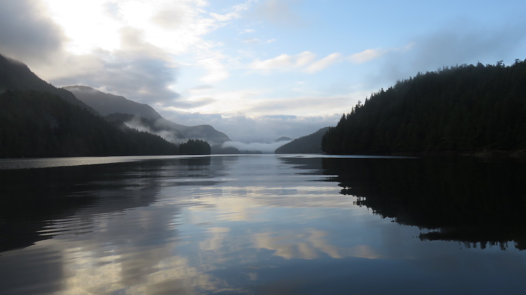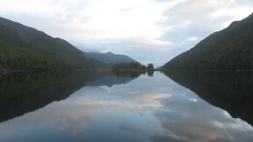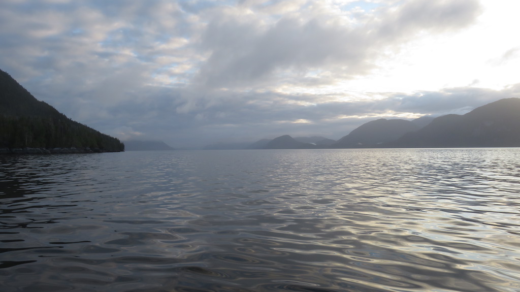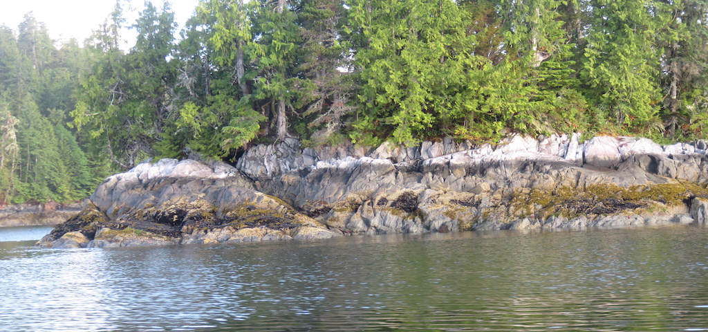 Close along the shore in the narrow channels, i admired the bands of rock & tidal life. There were 3 bald eagles on a branch, a seal, a dolphin. The sky was dramatic, grey, but with openings in the gloom to white cumulus above, and godlight. A perfect day for the return to Reid Passage.