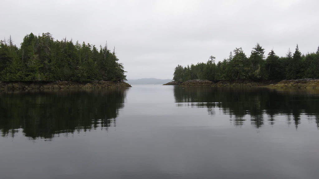 But The Sea has other ideas. The ocean waves are BIG, indeed higher than my roof, and irregular. This is just scary, so i make a new plan, head up Smith Sound, and manage to navigate to a tranquil cove, the navigation, amidst the waves and sky that have turned grey, also hard, because all the numerous islands look alike, but luckily this cove does have a buoy outside it, so i know i'm at the right place.