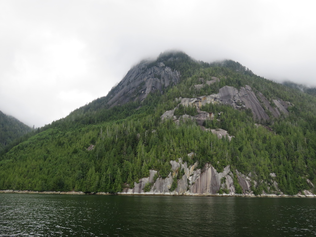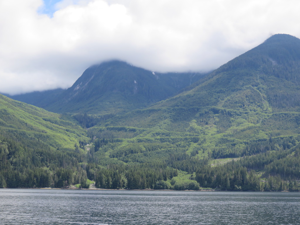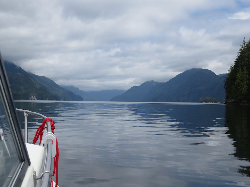 Now into the Queen Charlotte Channel (wow everything in Canada seems named after English monarchy, ick, do they mind?) it changes, the sea that smooth surreal pulsating slick oily look, grey but glowing yellow, the oddest thing, low long-period waves following, they're barely apparent, but as i climb the ascending face the speed reduces to 12, then tho i dont even see them, slowly it speeds to 21, OMG, as i surf down the inapparent reverse slope, i lose my nerve, reduce the throttle, but it's insensitive, i cant make it gradual, so due to engine torque or who-knows i lurch sideways, inducing exactly the ~broach i was intending to avoid. And it happens over&over. Nothing~serious, i am so lucky, relatively benign but nerve-wracking, always on the edge of... ~something.