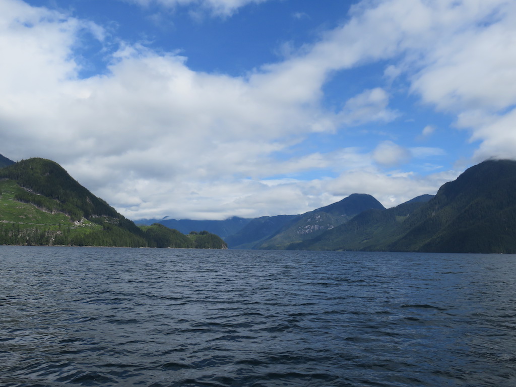 Now out to cross Knight Inlet, it's insane, big waves, each splays a splash from the bow which the wind blows back across the windshield. OK, i only have to cross it, not far, i can handle this, but i see a big trawler followed by little ones, like a mother hen and chicks, o my the chicks, probably C-Dory 22s, a popular mini-trawler, are smaller even than i! Poor bastards, in this! For the very first time, i feel, comftably, Big.