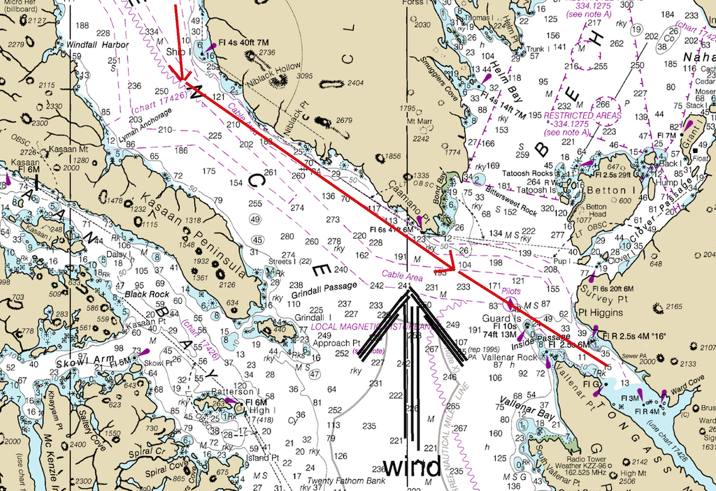 But there was nowhere to go. All the potential ~anchorages were oriented fully to the wind, so no possible shelter at all, & besides they were beset with rocks.